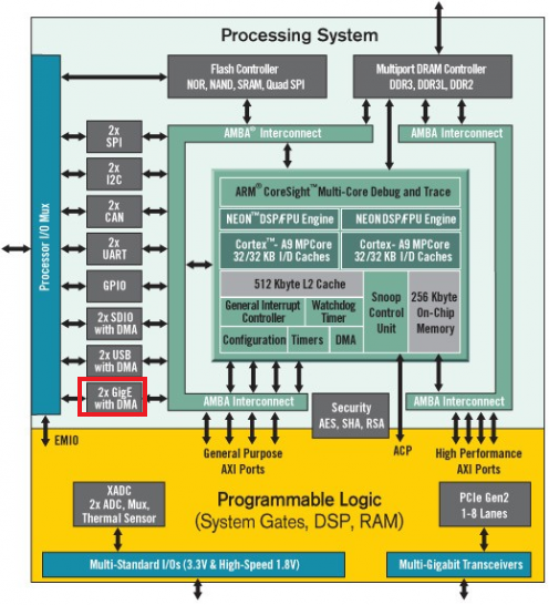 그리고 Zybo z7-20 보드는 위 그림에서 볼 수 있듯이 Processing system(PS) 영역에 GigE가 연결되어 있음을 알 수 있습니다.