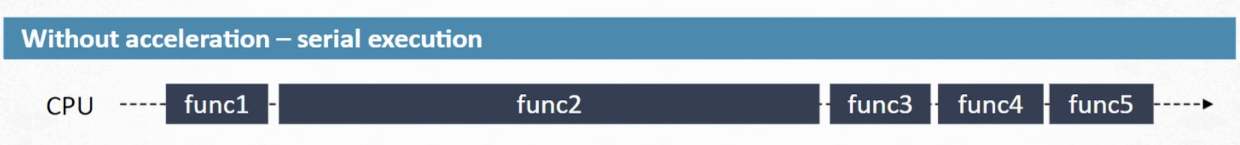 CPU(SW)는 순차적인 처리만 가능하다. 들어오는 순서대로 실행하기 때문에 func2와 같은 수행 시간이 긴 작업이 중간에 있으면 전체 수행 시간도 그만큼 늘어난다. 전체 수행 시간을 단축 시키려면 CPU의 연산 처리 성능을 올리는 수 밖에 없다. (일반적으로)