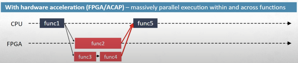 하지만 만약 FPGA를 같이 사용한다면 시간을 단축시키는 방법이 생긴다. FPGA는 병렬 처리가 가능하기에 수행 시간이 긴 func2를 동작시키면서 '동시에' func3과 func4를 처리할 수 있다. 그러면 결과적으로 전체 수행 시간이 단축된 것을 볼 수 있다.