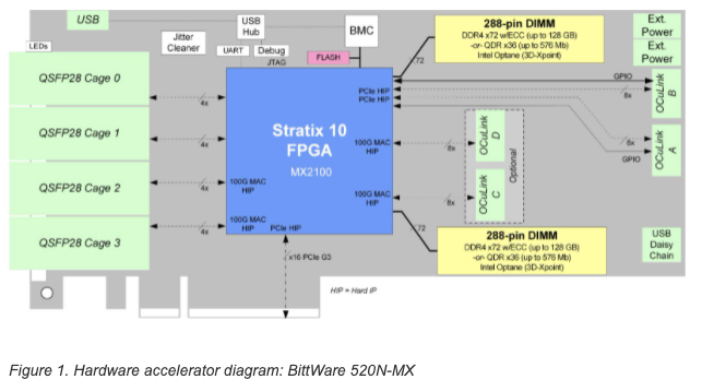 Compute Accelerators: Designed for compute-intensive data center applications, BittWare's 520N-MX is a PCIe board built using Intel's Stratix 10 MX FPGA with integrated HBM2 (high bandwidth memory) at 512 Gbps. Four QSFP28 cages supporting up to 100G per port makes it ideal for clustering, and OCuLink connectors allow for expansion. This board supports both traditional HDL and higher abstraction C, C++, and OpenCL. Its flexible memory architecture allows a broad range of memory types to be coupled to the FPGA fabric: QDR-II+ SRAM, DDR4 SDRAM, Intel Optane 3D-XPoint, and NVMe SSDs. The 520N-MX features a Board Management Controller (BMC) for advanced system monitoring and control, which significantly simplifies platform integration and management.
