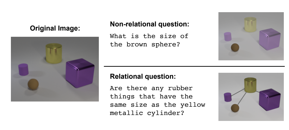 - RN을 이용해 주어진 장면을 학습시키면 테이블 위 여러 개 사각형, 구 등 다양한 모양으로 이뤄진 사물간 관계를 추론할 수 있음