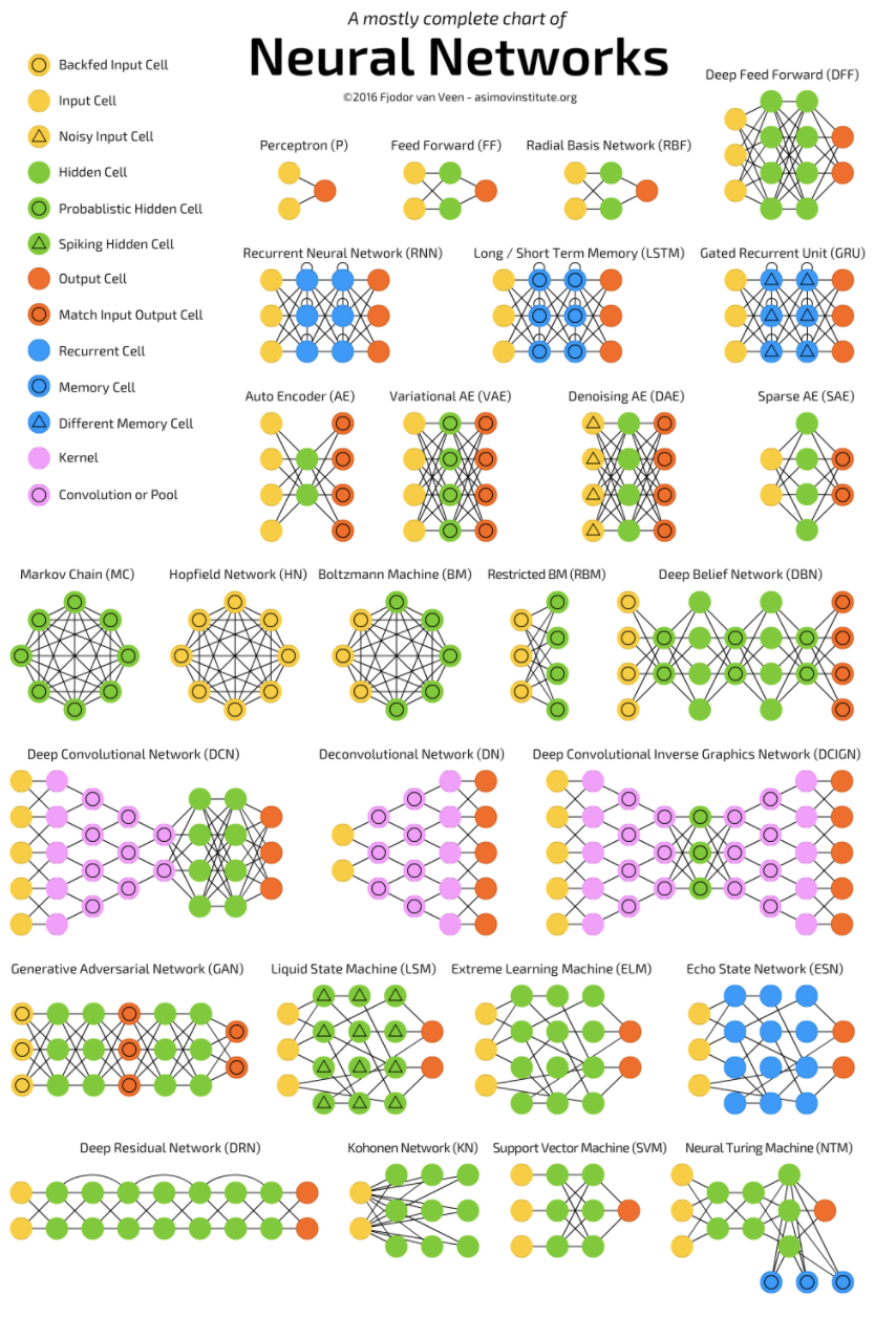 With new neural network architectures popping up every now and then, it’s hard to keep track of them all. Knowing all the abbreviations being thrown around (DCIGN, BiLSTM, DCGAN, anyone?) can be a bit overwhelming at first. So I decided to compose a che
