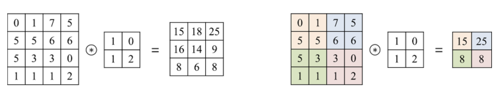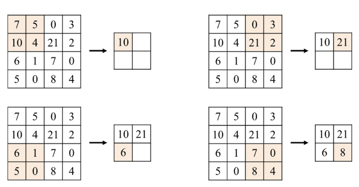 아래 그림은 stride가 2로 설정된 max-pooling 기반 풀링 계층의 동작을 보여준다.