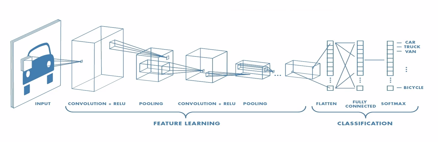 CNN은 위 이미지와 같이 이미지의 특징을 추출하는 부분과 클래스를 분류하는 부분으로 나눌 수 있다. 특징 추출(Feature extraction/learning) 영역은 Convolution Layer와 Pooling Layer를 여러 겹 쌓는 형태로 구성된다. Convolution Layer는 입력 데이터에 필터를 적용 후 활성화 함수를 반영하는 필수 요소이다. Convolution Layer 다음에 위치하는 Pooling Layer는 선택적인 레이어이다.