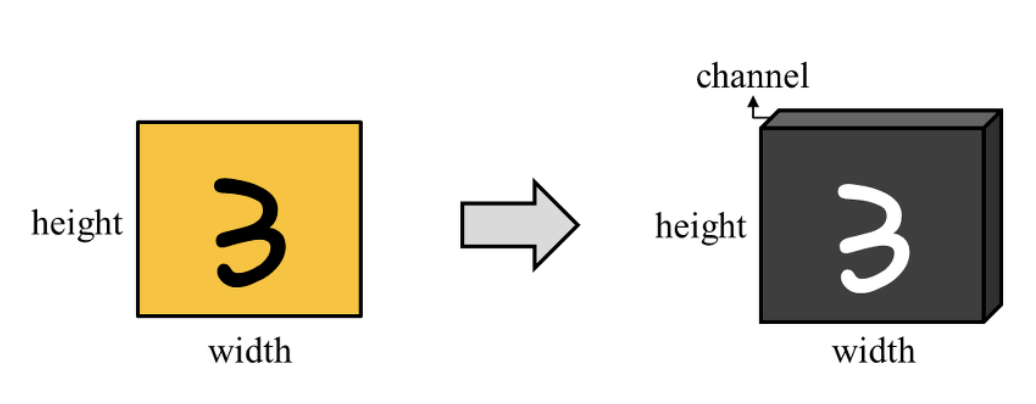 이미지 데이터는 그림 4와 같이 높이X너비X채널의 3차원 텐서 (tensor)로 표현될 수 있다. 만약, 이미지의 색상이 RGB 코드로 표현되었다면, 채널의 크기는 3이 되며 각각의 채널에는 R, G, B 값이 저장된다.