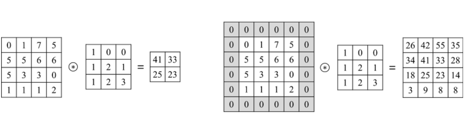 아래 그림의 오른쪽처럼 1폭짜리 zero-padding을 적용하였더니 출력 이미지 크기가 입력 이미지 크기와 같이 4x4 로 유지된다.