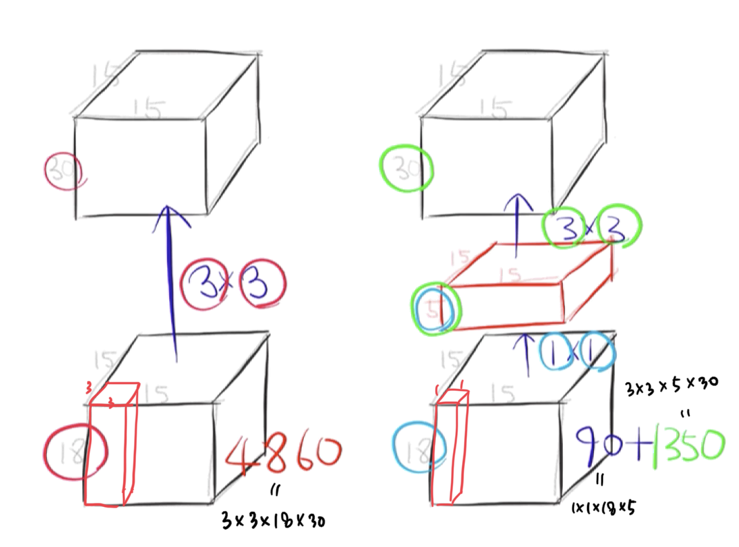 위 그림을 보면 동일한 단위의 Filter에서 1 x 1 convolution layer를 추가했음에도 불구하고 총 파라미터 갯수는 1440으로 기존보다 더 적어짐을 알 수 있다. 즉, 이를 통해 dimension reduction을 하는 효과를 얻은 것이다.