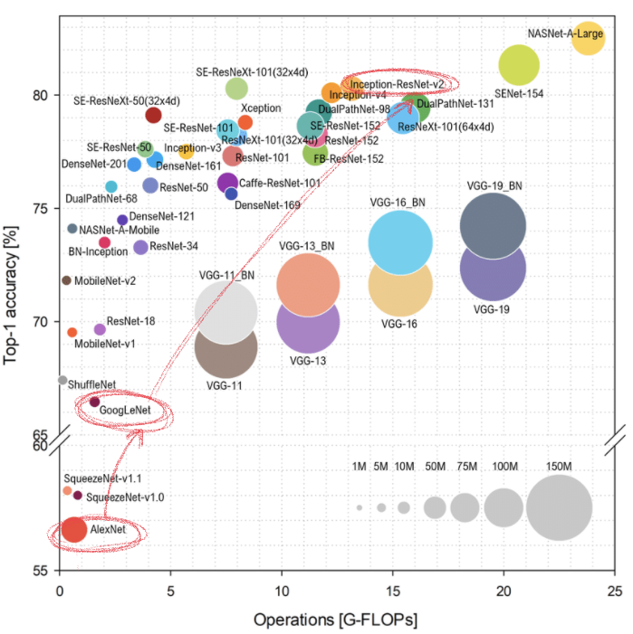 이번 포스팅에서 다룰 모델은 AlexNet, GoogLeNet, ResNet 이다. 적은 순서대로 점차 기술이 발전했으며 이는 위 그래프를 통해서도 알 수 있다. 그래프는 x축은 Operations. 즉, 연산 처리량을 말하며 y축은 Accuracy로 연산 정확도를 뜻한다. 그리고 원의 크기는 사용되는 메모리의 용량이다.