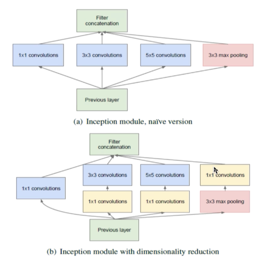 기본적인 Inception module은 아래 (a)의 그림 처럼 여러 개의 갈림길을 갖는 것이다. 그럼 다양한 물체의 크기(이미지 크기)에 유동적으로 변화하여 결과 값을 뽑을 수 있다. 즉, 여러 상황에 대비하여 출력값을 얻을 수 있다.