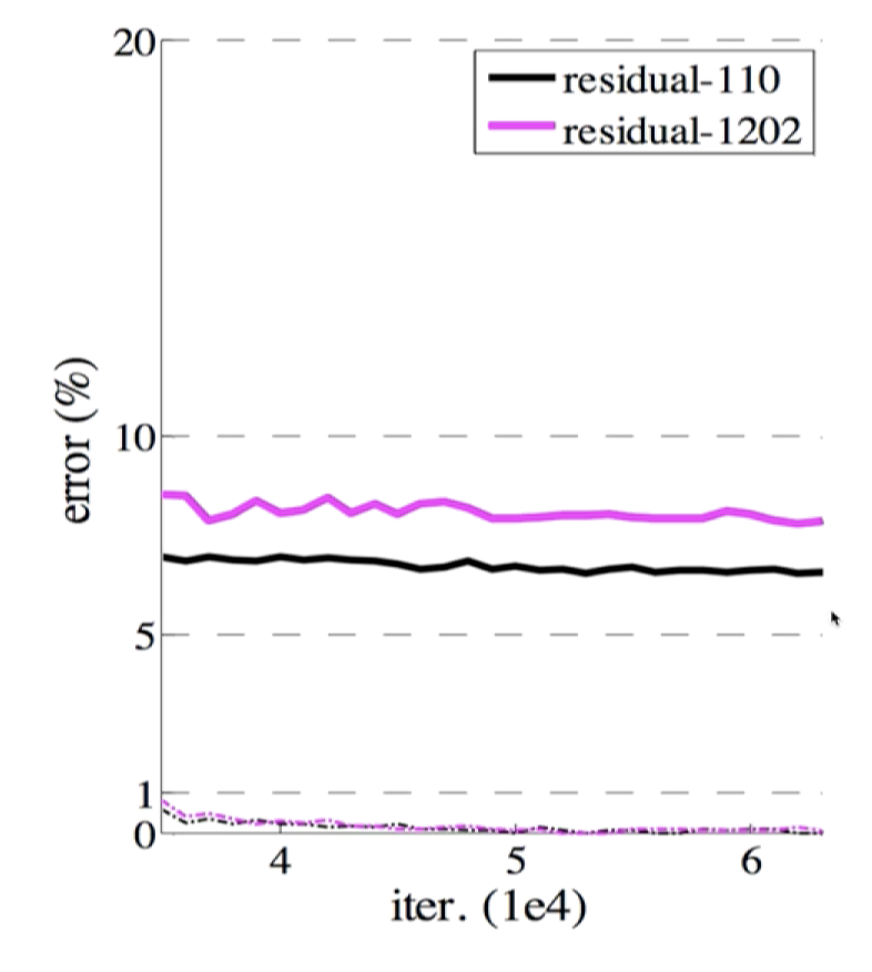 ResNet에 사용된 기법을 통해 100개 정도의 Layer까지의 학습은 많을 수록 성능이 더 좋아졌다. 하지만 그 이상으로 Layer 수를 늘리면 성능이 또 떨어지는 Degradation이 발생한다.