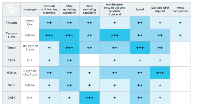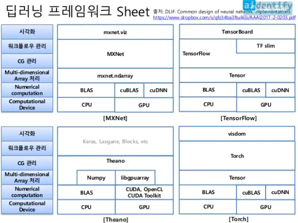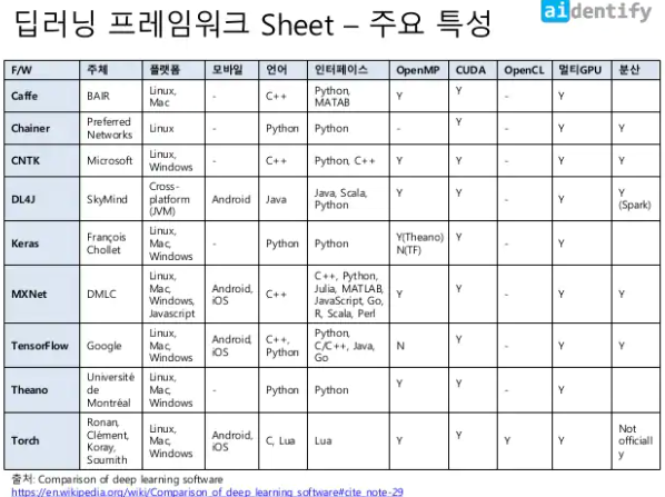 TensorFlow, Keras, PyTorch 이렇게 있습니다. 그리고 각각의 사용 언어, CNN과 RNN에서의 성능 등 특징이 모두 다양합니다.