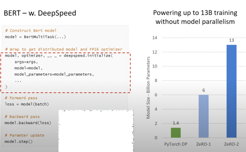 DeepSpeed는 Pytorch 기반이며 몇 줄의 코드를 추가하면 DeepSpeed를 사용가능하다. 또한 1.4B 파라미터 이상의 Pytorch기반 모델은 Data Parallelism만을 사용할 때 OOM이 발생하지만 ZeRO-2는 13B까지 Model parallelism 없이 Data Parallelism을 사용할 수 있다.