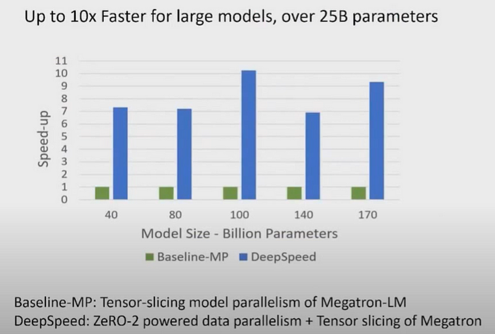 Megatron-LM은 tensor-slicing model parallelism를 사용한다. Megatron-LM의 tensor-slicing model parallelism에 DeepSpeed ZeRO-2의 data parallelism을 추가하면 DeepSpeed가 Megatron-LM보다 10x 더 빠르다.