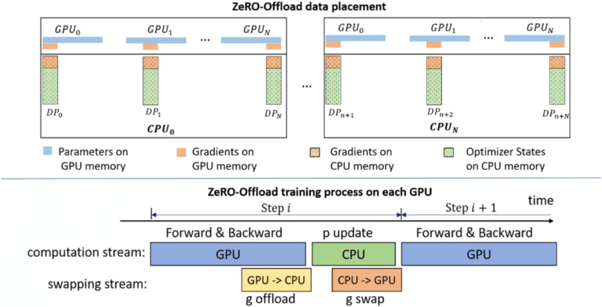 ZeRO-Offload라고 불리우는 ZeRO-3는 gradients, optimizer states와 optimizer 연산을 CPU로 offloading한다. Parameters와 forward & backward 연산은 GPU에서 유지한다.