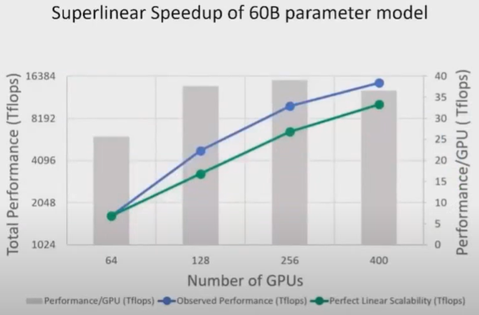 디바이스 개수의 증가에 따라 superlinear speedup을 달성할 수 있다. 녹색 그래프는 perfect linear scalability로 실제로 디바이스 개수에 따른 산술적인 성능이라면, DeepSpeed를 사용하면 perfect linear scalability보다 더 높은 성능을 보인다.