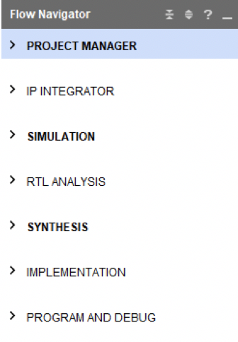 프로젝트 관련 설정 및 소스 코드 관리, Xilinx IP 관리 등을 할 수 있다. 간단히 프로젝트 관련 설정 내용이 다 모여 있다고 보면 된다.
