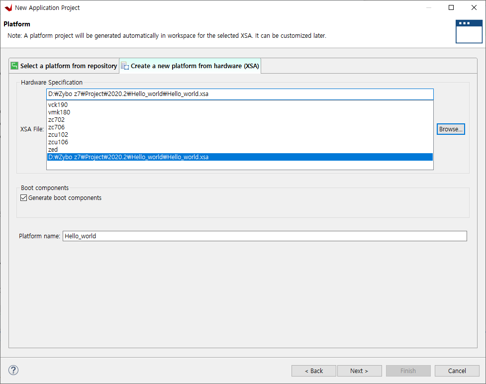 이때 bitstream을 포함하여 hardware platform을 생성해야 한다.