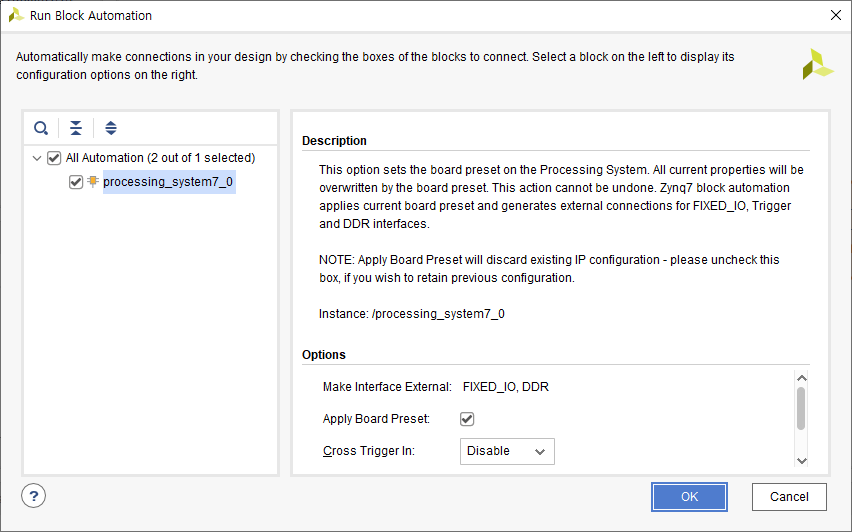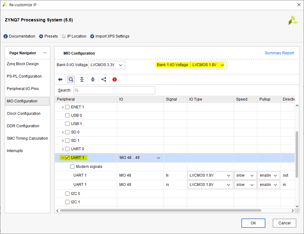 기본 옵션인 ZYNQ IP를 사용하여 PC와 시리얼 통신을 할 수 있게 'UART1'을 설정한다.