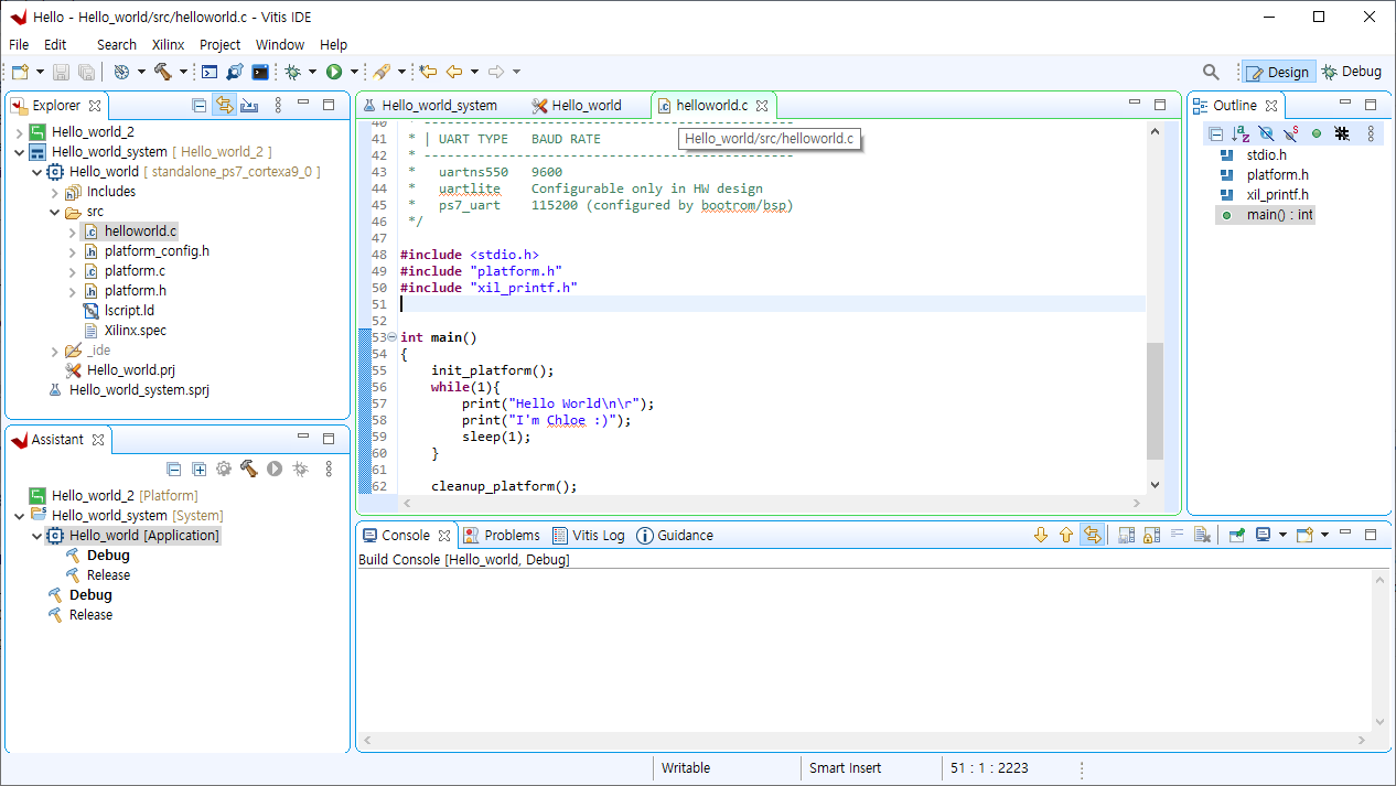 Vivado 툴에서 만든 Hardware platfrom .xsa 파일을 Vitis 툴을 통해 Application 단의 코딩을 진행한다.