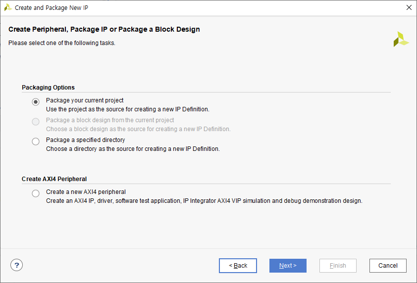 원하는 HW 구성의 Block diagram을 만들 때, 기본 설정으로 없는 Package IP를 아래와 같은 방식으로 만들 수 있다.
