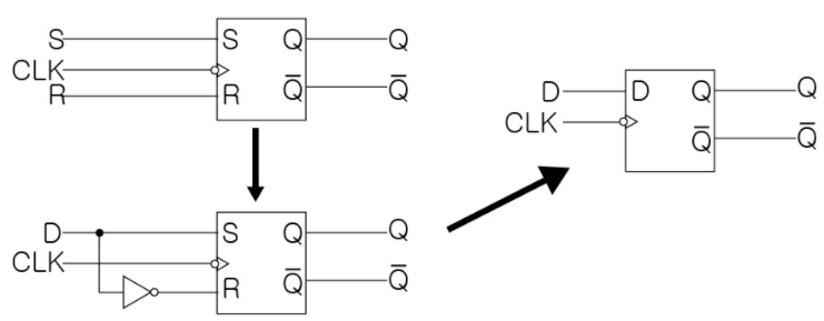- 특징: D 라는 1개의 데이터 입력을 가지며 D 입력에 가해진 데이터를 Clock 신호에 의해서 출력으로 그대로 전달된다. D는 현재 상태를 지연시키는 역할이며 Data 전달과 Delay라는 의미를 담고 있다.