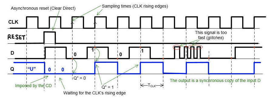 Reset이 '1'이 되면 CLK edge와 상관없이 Q가 0으로 Reset 된다.