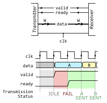 Data의 전송은 Transmitter -> Receiver로 이루어지며, Transmitter는 아무때나 데이터를 보내지 않고 Receiver도 아무때나 데이터를 받지 않는다. Transmitter가 valid에 '1' 값을 실어 보내면 Receiver가 이 값을 받고 준비가 되었을 때 ready에 '1' 값을 실어서 보내준다.