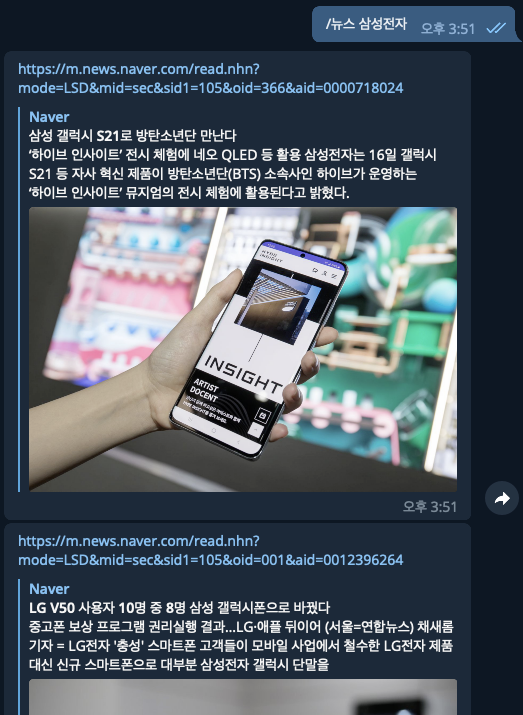 텔레그램 봇이 네이버에 검색해서 그 기업 최신 뉴스 5개를 뙇 내 앞에!