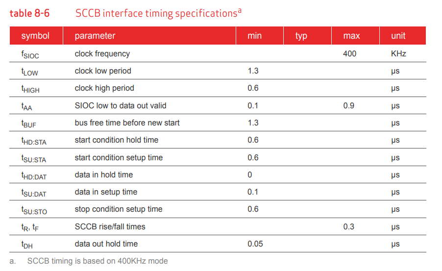 The Serial Camera Control Bus (SCCB) interface controls the image sensor operation.