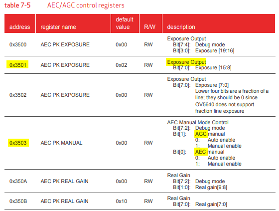 1) '0x3503'에 '03'을 적용하여 Auto Exposure mode OFF, Auto Gain mode OFF를 한다.