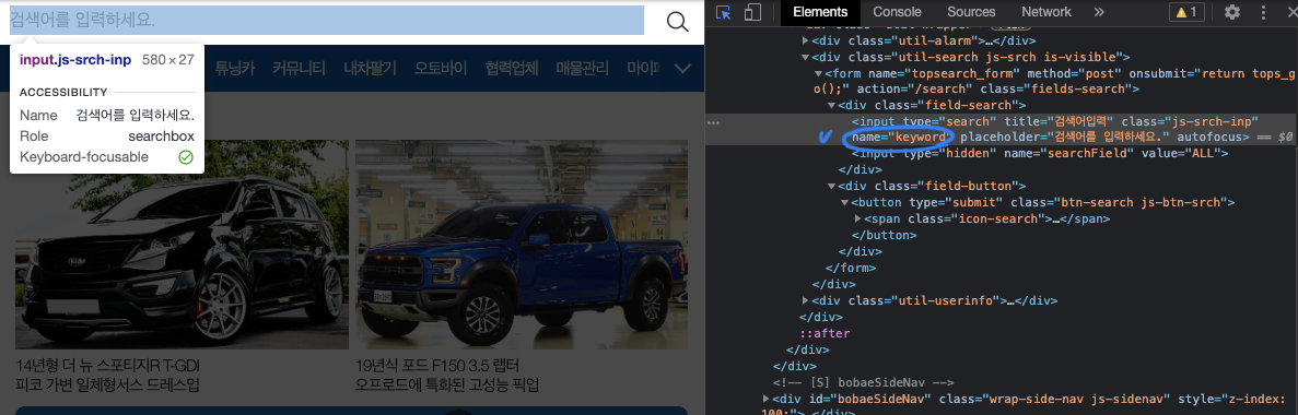 돋보기 버튼을 누르면 아래처럼 검색창이 생기고 여기에 접근하기 위해서는 'name=keyword'에 주목해야 한다.
