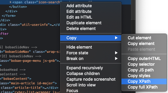 위에 파란색으로 물결 친 라인을 우클릭 한 후, Copy - Copy XPath를 클릭하면 XPath 주소가 복사된다.