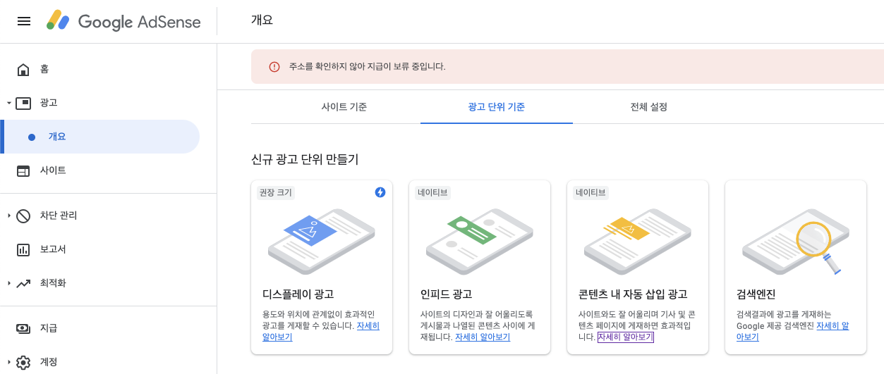 3. 신규 광고 단위 만들기에서 원하는 유형을 선택한다.