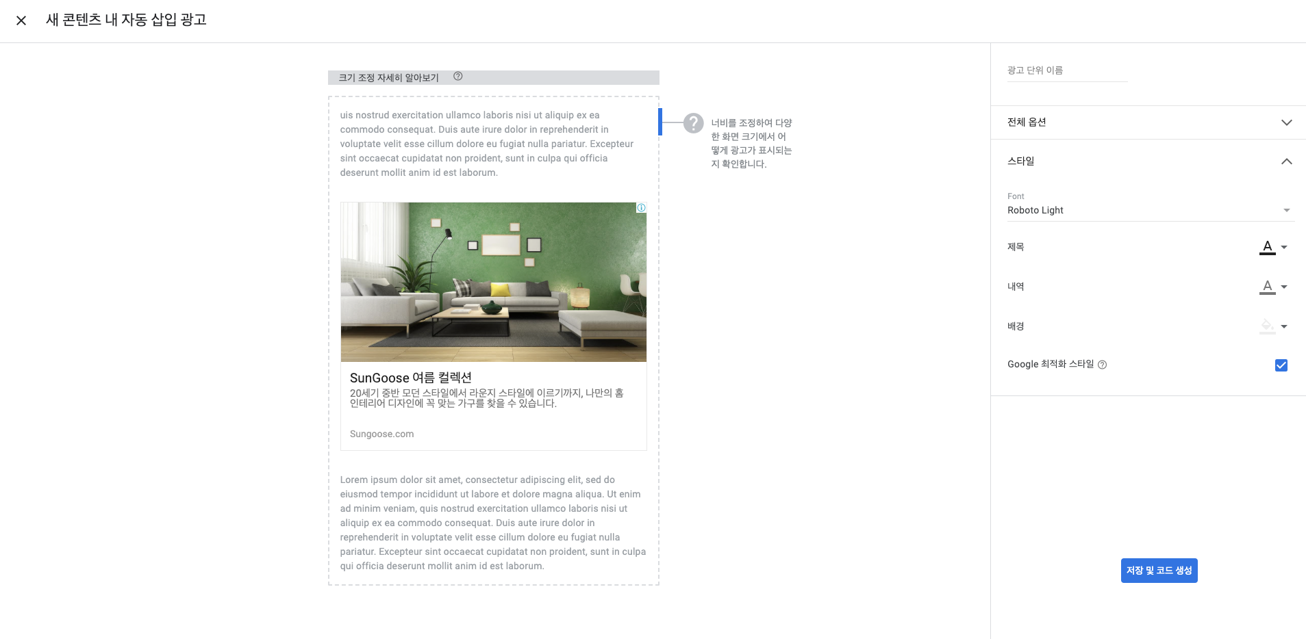 4. 광고 단위 이름을 선정하고 광고 서식 스타일을 선택하여 저장한다. (코드 생성)